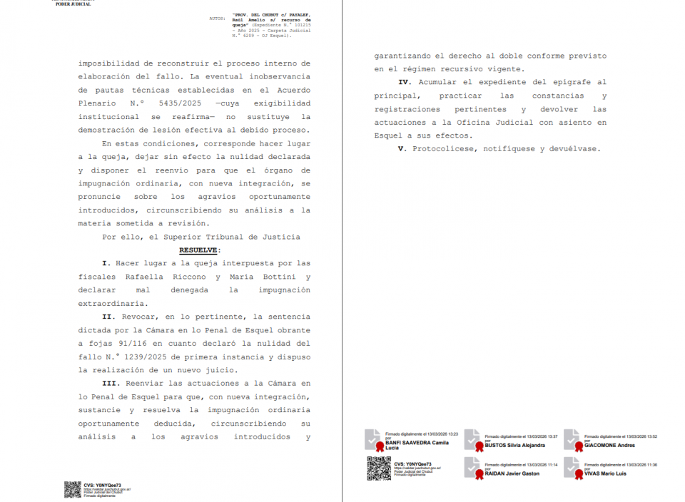 Con esta resolución, el STJ dispuso reenviar las actuaciones a la Cámara Penal de Esquel para que, con una nueva integración de jueces, resuelva los reclamos de fondo de la defensa que habían quedado pendientes. El criterio establecido por el STJ sobre el uso de la IA será de cumplimiento obligatorio para los nuevos jueces que intervengan en el caso.